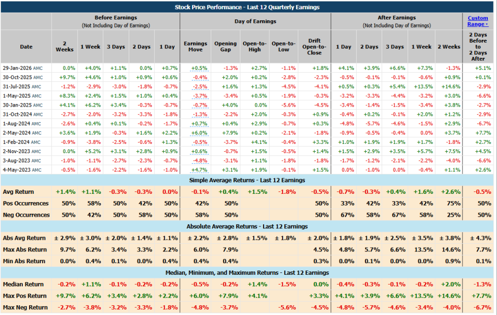Market Chameleonでは、過去の決算時に株価がどの程度動いたのかを一覧で確認できます。