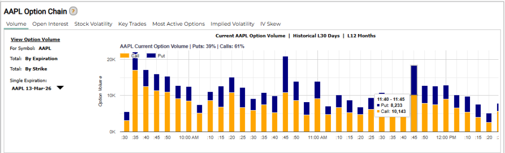 Market Chameleonでは、オプション出来高を時間ごとに確認することができます。