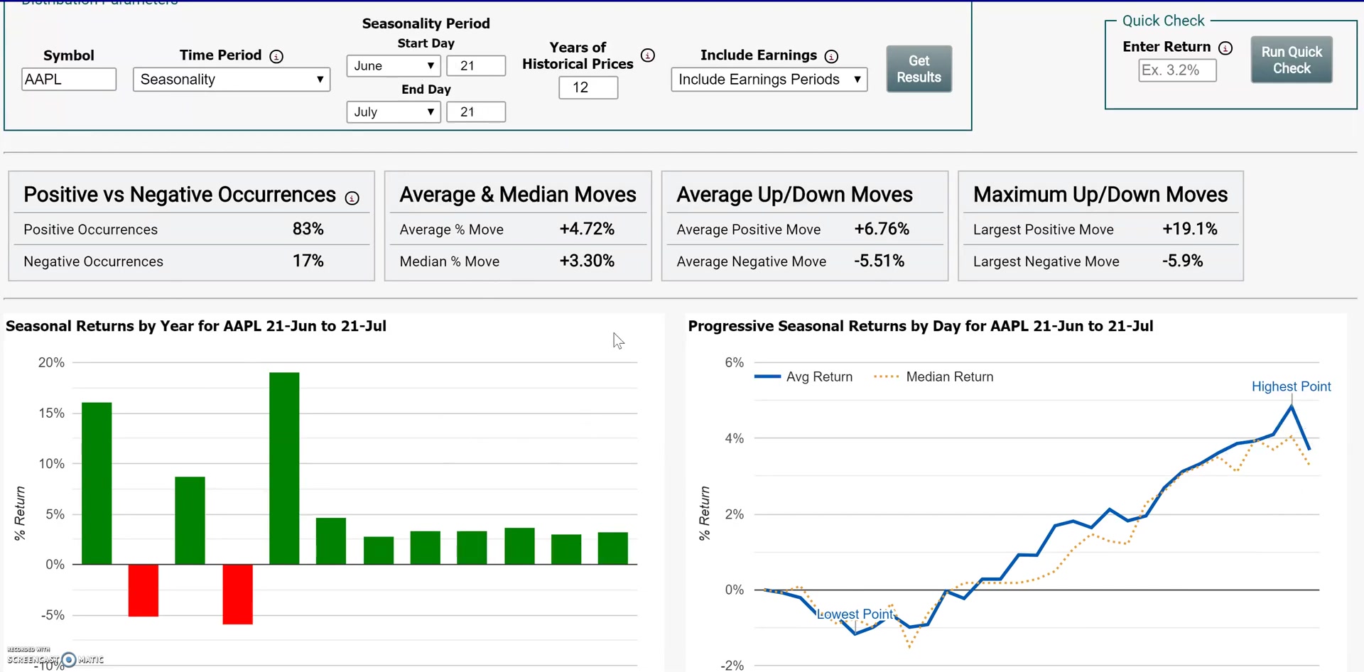 Seasonal Analysisは、その期間に上昇傾向が見られるか、どれくらい動いたかを確認するツールです。